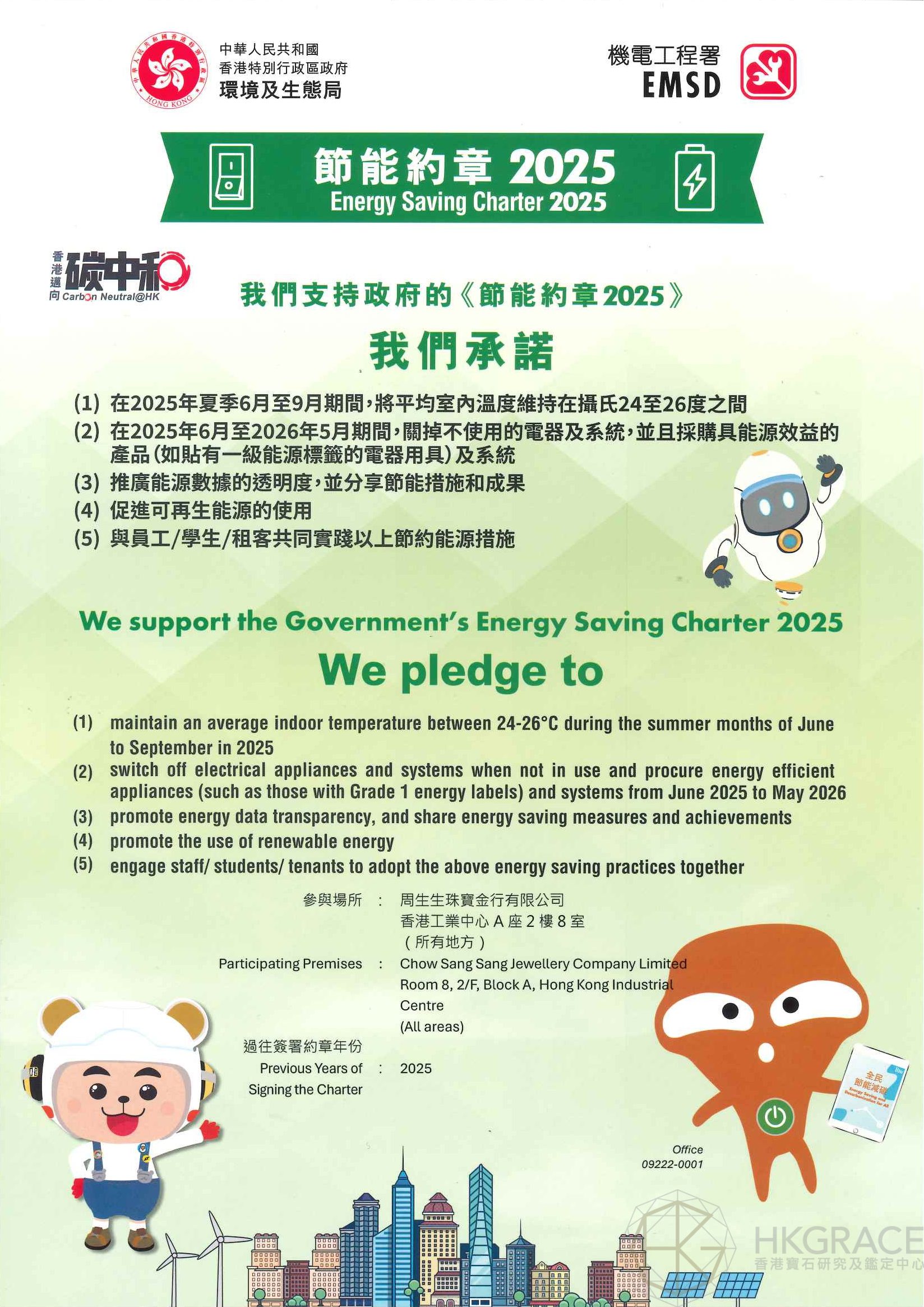 HKGRACE签署了香港政府的「4T约章」及 「节能约章」,承诺订立节能目标及时间表,并保持标准室内平均温度。